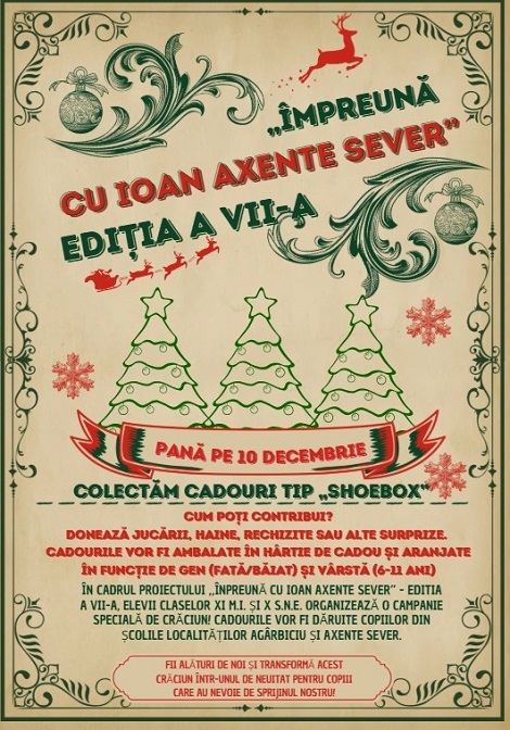 În acest context luna decembrie se anunță încărcată de evenimente școlare și extrașcolare la Liceul Teoretic „Axente Sever”. Pe parcursul acestei luni se va derula campania de tip Shoebox din cadrul proiectului „Împreună cu Ioan Axente Sever” pentru copiii din școlile gimnaziale din Axente Sever și Agârbiciu. Elevii unității noastre de învățământ sunt invitați să doneze jucării, haine, rechizite sau alte mici surprize, în cutiile special amenajate la liceu. Ulterior acestea vor fi ambalate și aranjate după gen (băieți/fete) și vârstă (6-11 ani).